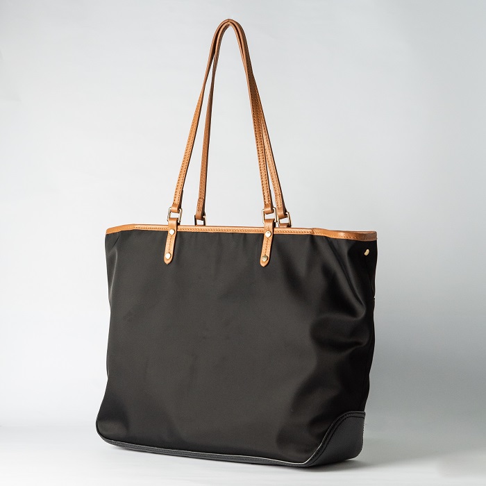 This ultra lightweight Leather/Nylon horizontal Tote handbag, is made from water-resistant smooth nylon material and trimmed with premium Saffiano leather. It is fully lined either in matching or contrasting colour fabric.